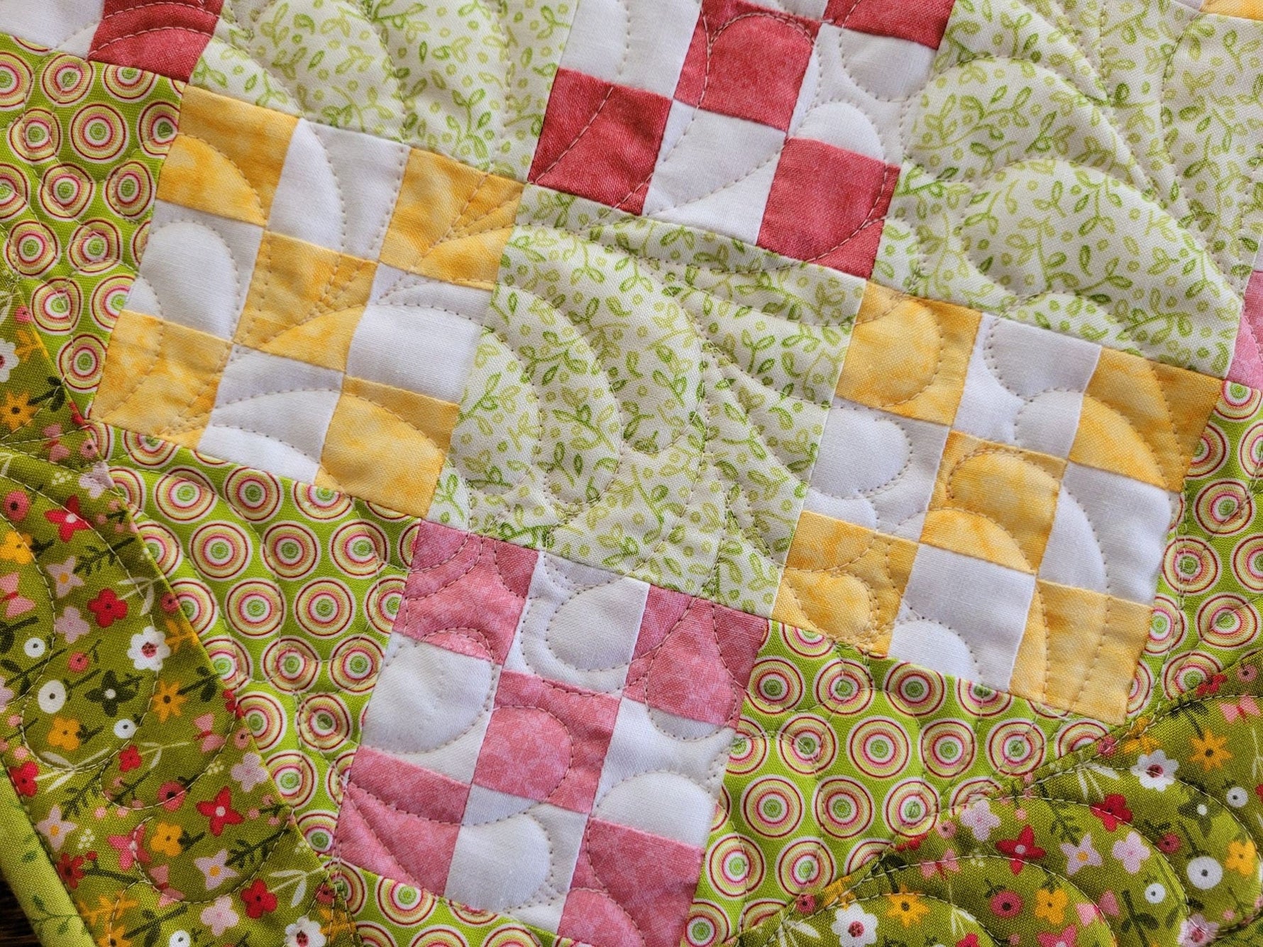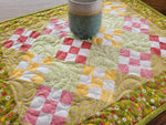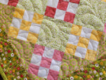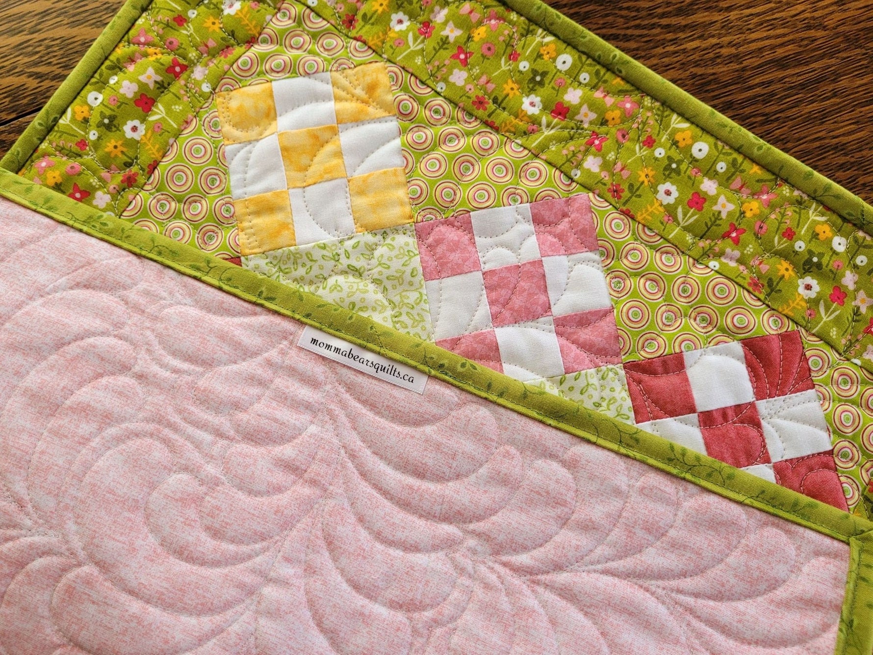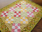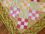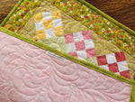 This bright and cheerful quilt is perfect for your spring and summer table decor. Pink and yellow nine patch blocks are surrounded by a cute floral print that ties it all together. All over feather quilting adds lovely texture.