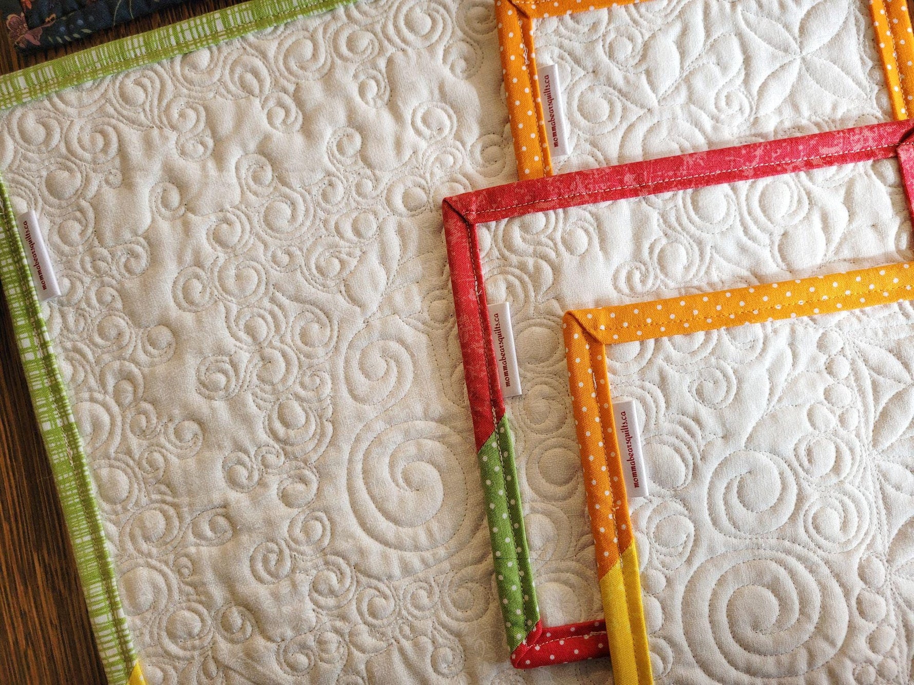 Small scrap quilts are always so appealing! The intricate patchwork piecing and custom quilting make this a special set. You can use it in many ways, but it is particularly suited as wall decor, with the eye-catching quilting and bright fresh colours. A lovely focal point for your kitchen, office, or wherever you need a little something extra.🌞