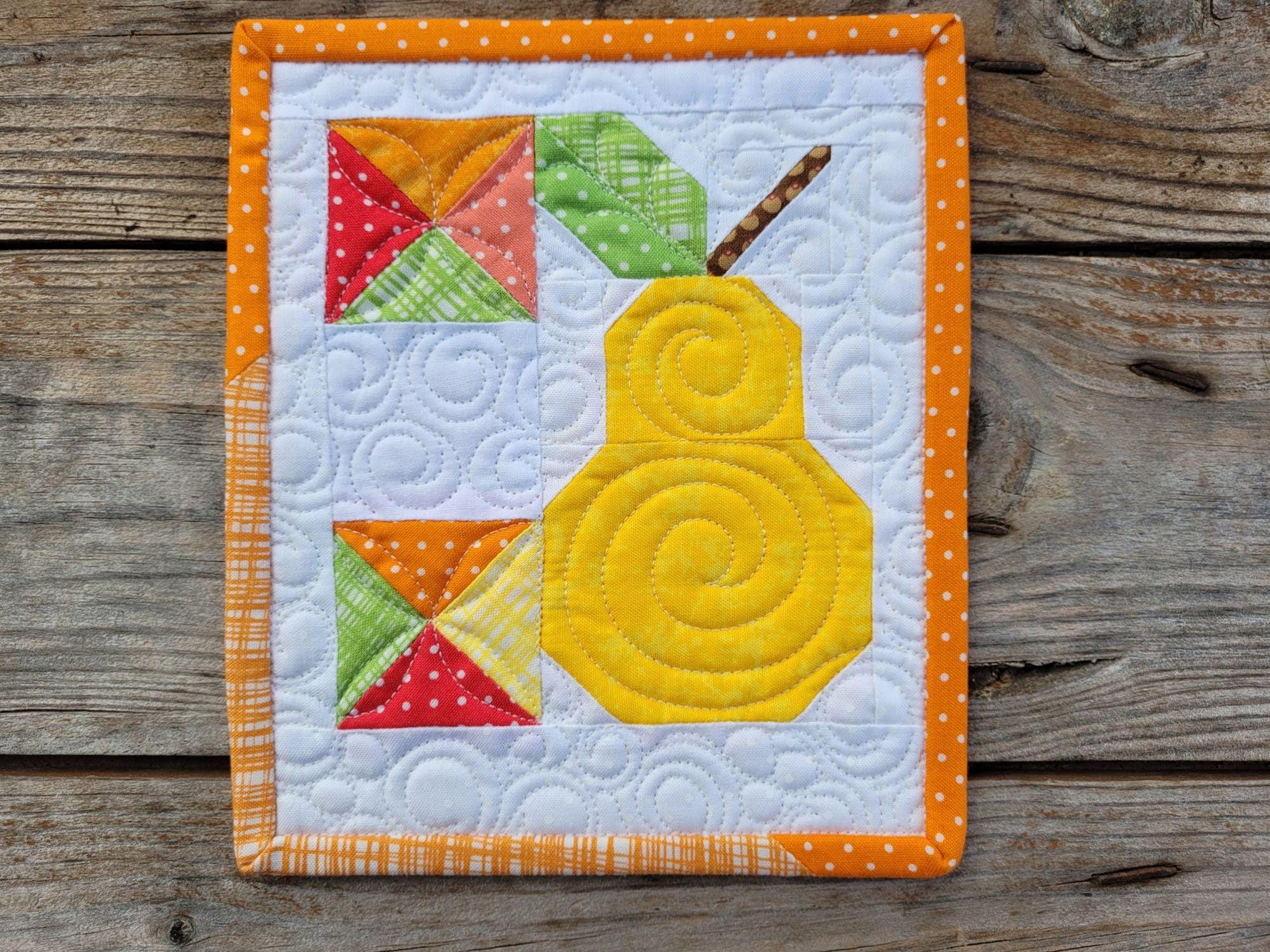 The colourful fabrics are cheerful and fun, and the scrappy binding is a cute finishing touch. This was an improvisational project that I made from scraps from a larger project. For interests sake, the stem of the pear measures only 5mm across and the small squares are only 2 cm!