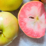 Why We Grow It: One of Steph's favourites! Pink Pearl is a delicious apple that is crisp with a pronounced unique fruity flavour and a nice blend of sweetness and sharpness. Its yellow-pink skin conceals a bright pink interior that is stunning to see compared to the white-ish flesh of most apples. It is great fresh or for applesauce, and it is relatively slow browning- it can be cut and bagged in the fridge the night before with very little change in colour the next day. Their pink colour adds a unique visual appeal to baked goods as well, such as with the gooseberry and Pink Pearl tarts Steph made pictured here!
