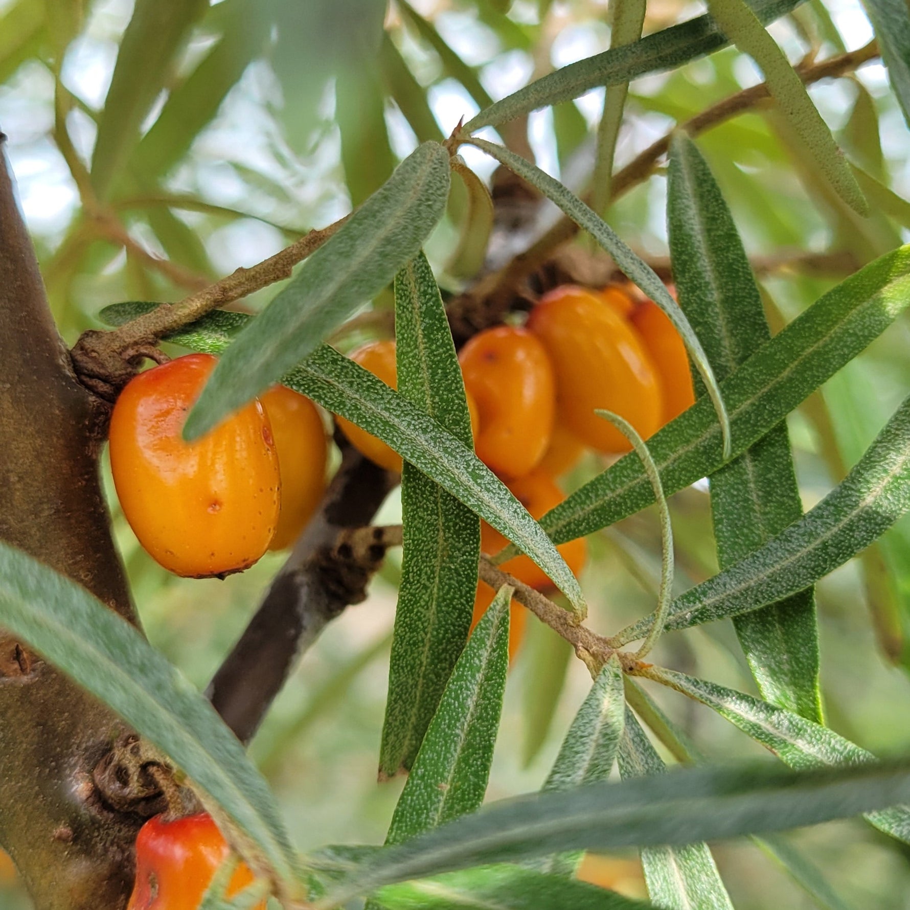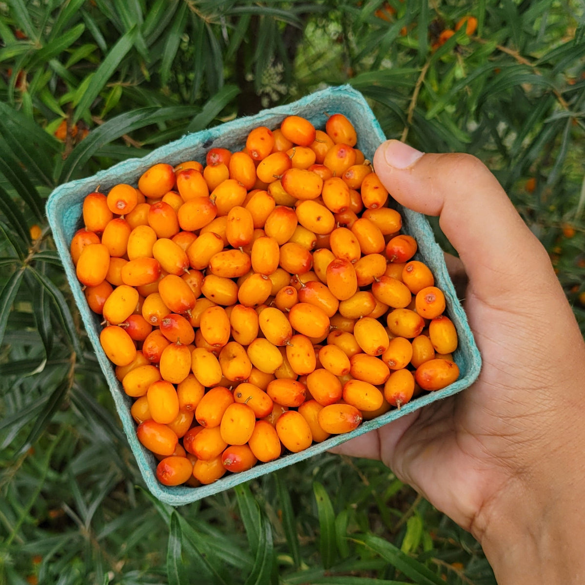 Why We Grow It: A prolific variety that holds onto berries well, prolonging harvest for 4-6 weeks. The berries have a milder flavour compared to other sea buckthorns with much lower acid content. They can be made into a sunshine yellow juice, best diluted 70% with water for a Canadian version of orange juice. It's also nearly thornless, which makes harvesting much easier.