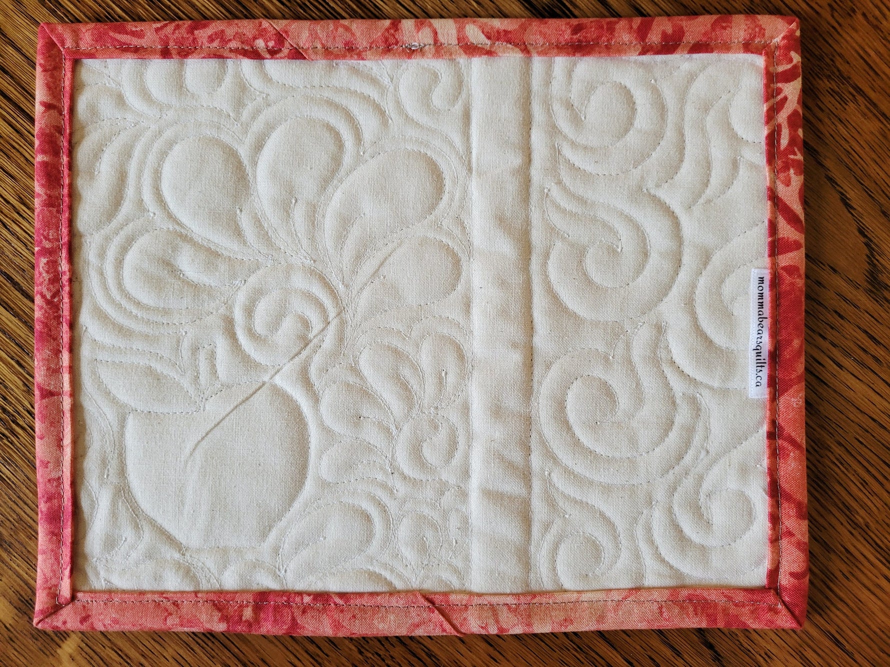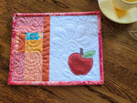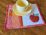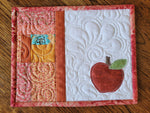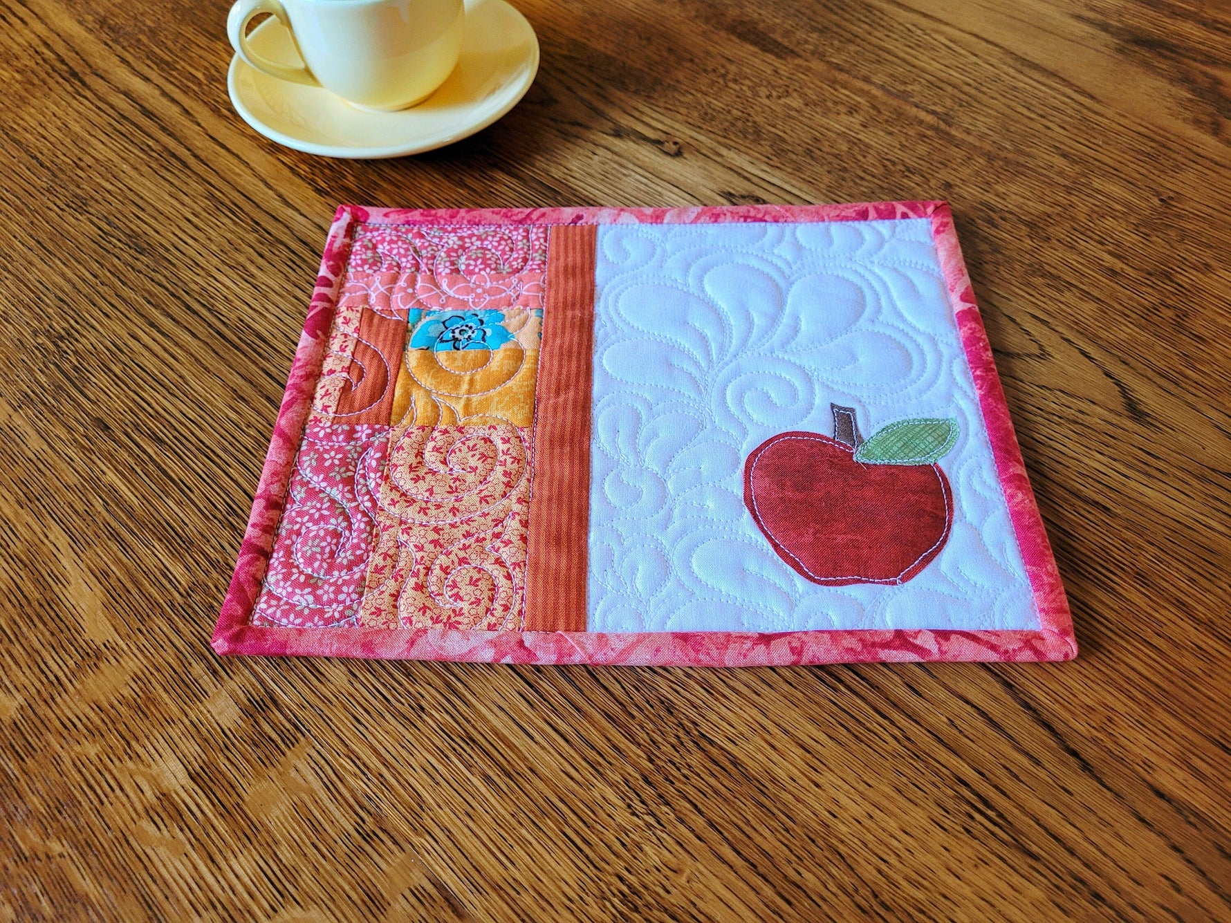 This small apple quilt is perfect as a coaster or snack mat. Scrappy patchwork with hand cut apple applique has one of a kind charm. Pretty quilted texture makes this extra special. A great mug rug gift for a teacher or desk coaster for a secretary.
